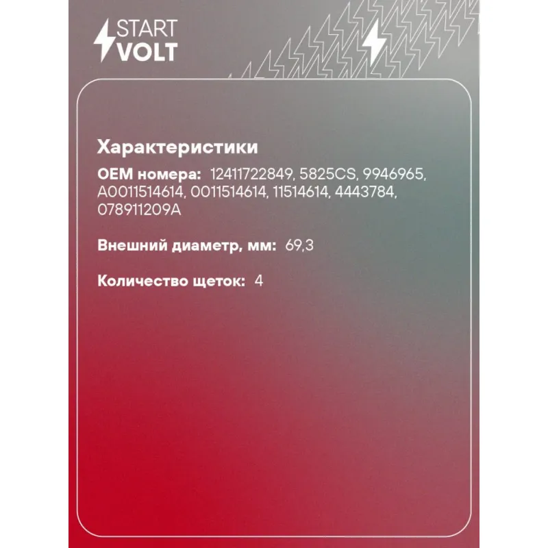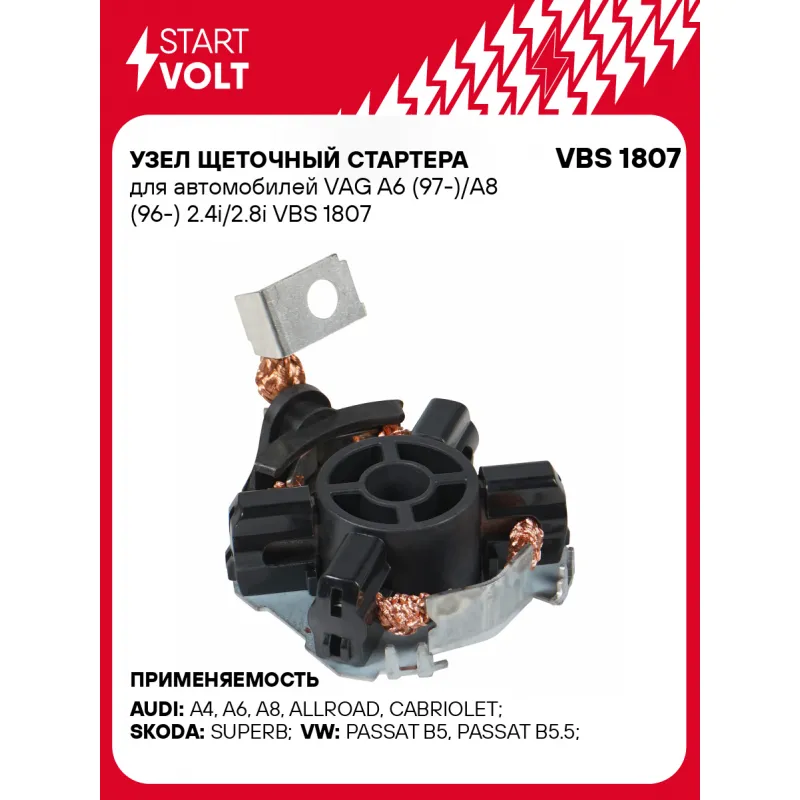 Узел щеточный стартера для автомобилей VAG A6 (97-)/A8 (96-) 2.4i/2.8i Характеристики: Артикул: VBS 1807 OEM номера: 12411722849, 5825CS, 9946965, A0011514614, 0011514614, 11514614, 4443784, 078911209A Размер щетки: 16x5 Количество на автомобиль: 1 Количество щеток: 4 Внешний диаметр, мм: 69,3 Резьба: M4 Комплектация: Щеточны... Читать полностью →