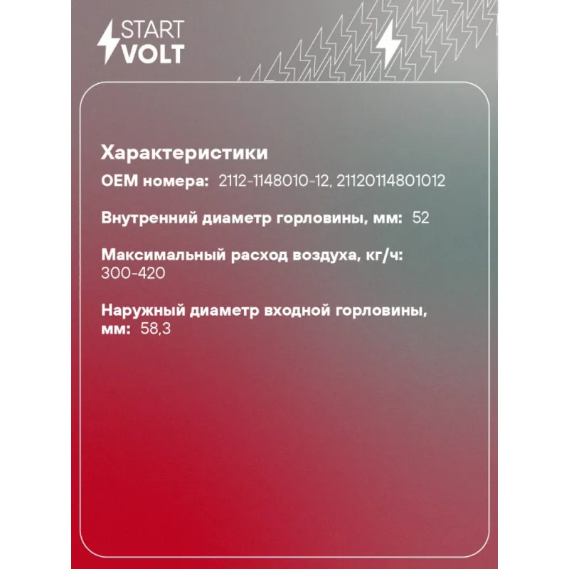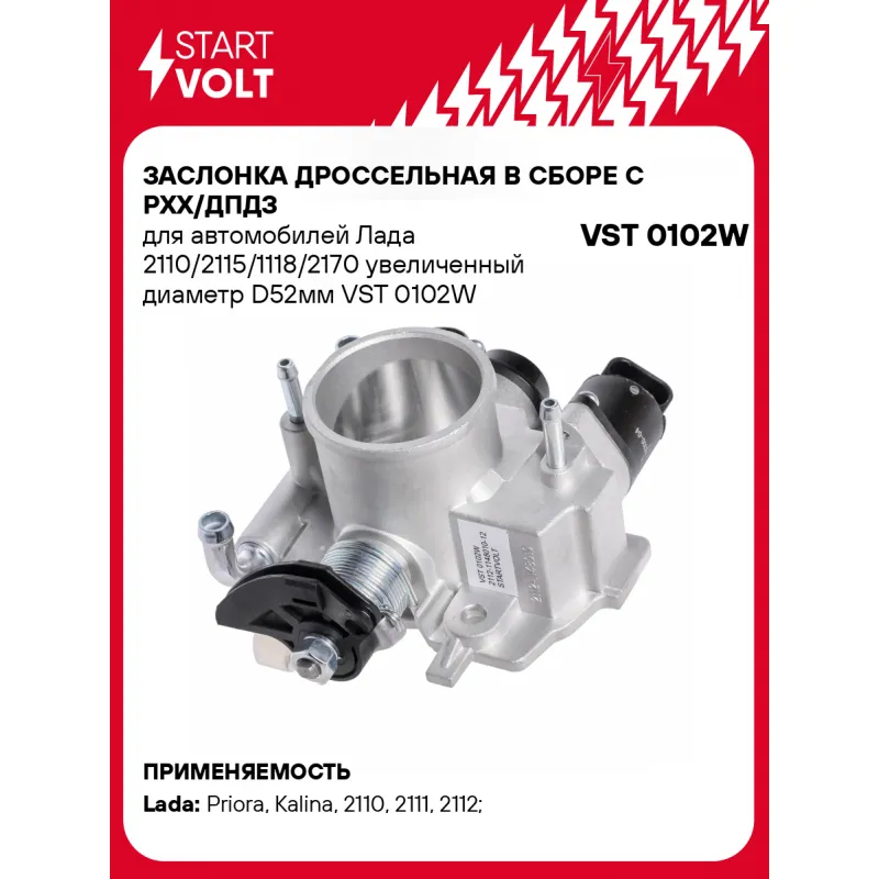 Заслонка дроссельная в сборе c РХХ/ДПДЗ для автомобилей Лада 2110/2115/1118/2170 увеличенный диаметр D52мм Характеристики: Артикул: VST 0102W OEM номера: 2112-1148010-12, 21120114801012 Количество на автомобиль: 1 Внутренний диаметр горловины, мм: 52 Максимальный расход воздуха, кг/ч: 300-420 Наружный диаметр входной горловины, мм: 58,3 Сопутствующий товар: Регуляторы холостого хода: VSM 0111 Сопутствующий товар: Датчики положения дроссельной заслонки: VS-TP 0111 Подходит для авто: ВАЗ Priora (07-), Kalina (04-), 2110, 2111, 2112, 2113, 2114, 2115 Для проверки применяемости отправьте VIN автомобиля через вкладку "Есть вопросы о товаре?" Комплектация: Дроссельная заслонка - 1 шт Паспорт изделия/гарантийный талон Гарантия: от 1 года.