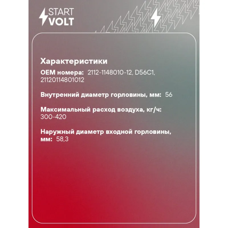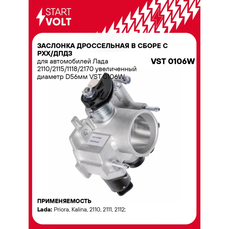 Заслонка дроссельная в сборе c РХХ/ДПДЗ для автомобилей Лада 2110/2115/1118/2170 увеличенный диаметр D56мм Характеристики: Артикул: VST 0106W OEM номера: 2112-1148010-12, D56C1, 21120114801012 Количество на автомобиль: 1 Внутренний диаметр горловины, мм: 56 Максимальный расход воздуха, кг/ч: 300-420 Наружный диаметр входной горловины, мм: 58,3 Сопутствующий товар: Регуляторы холостого хода: VSM 0111 Сопутствующий товар: Датчики положения дроссельной заслонки: VS-TP 0110 Подходит для авто: ВАЗ Priora (07-), Kalina (04-), 2110, 2111, 2112, 2113, 2114, 2115 Для проверки применяемости отправьте VIN автомобиля через вкладку "Есть вопросы о товаре?" Комплектация: Паспорт изделия/гарантийный талон Дроссельная заслонка - 1 шт Гарантия: от 1 года.
