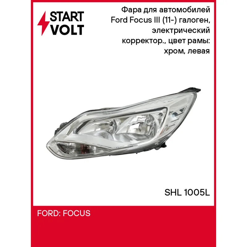 Фара для автомобилей Ford Focus III (11-) (головного света) галоген, электрический корректор., цвет рамы: хром, левая Характеристики: Артикул: SHL 1005L OEM номера: 1735194, 1 873 929, 1 721 997, 1 724 802, 1 735 210, 1710193, BM51-13W030-AE, BM51-13W030-AF, BM51-13W030-AG, 1713248, 1719072, BM51-13101-AF, BM51-13W030-AB, BM51-13W030-AC, BM51-13W030-AD Напряжение: 12В Сторона установки: Слева Тип осветительного прибора: Галоген Тип лампы/ламп: H7/H1/PY21W/W5W Оснащение (корректор): Электрический Функция осветительного прибора (ДХО/без ДХО): без ДХО Количество на автомобиль: 1 Сторона движения: правостороннее Комплектация: Фара в сборе - 1 шт Паспорт изделия - 1 шт Гарантия: от 1 года.